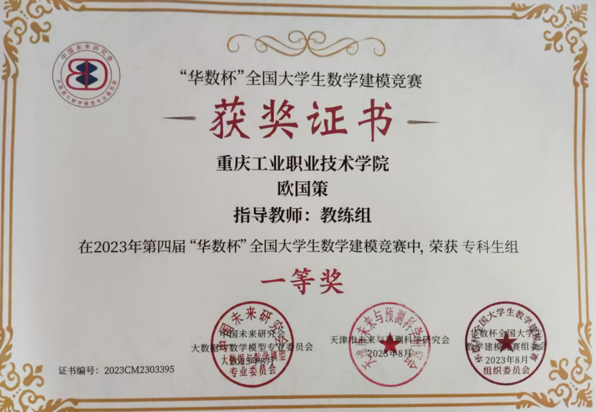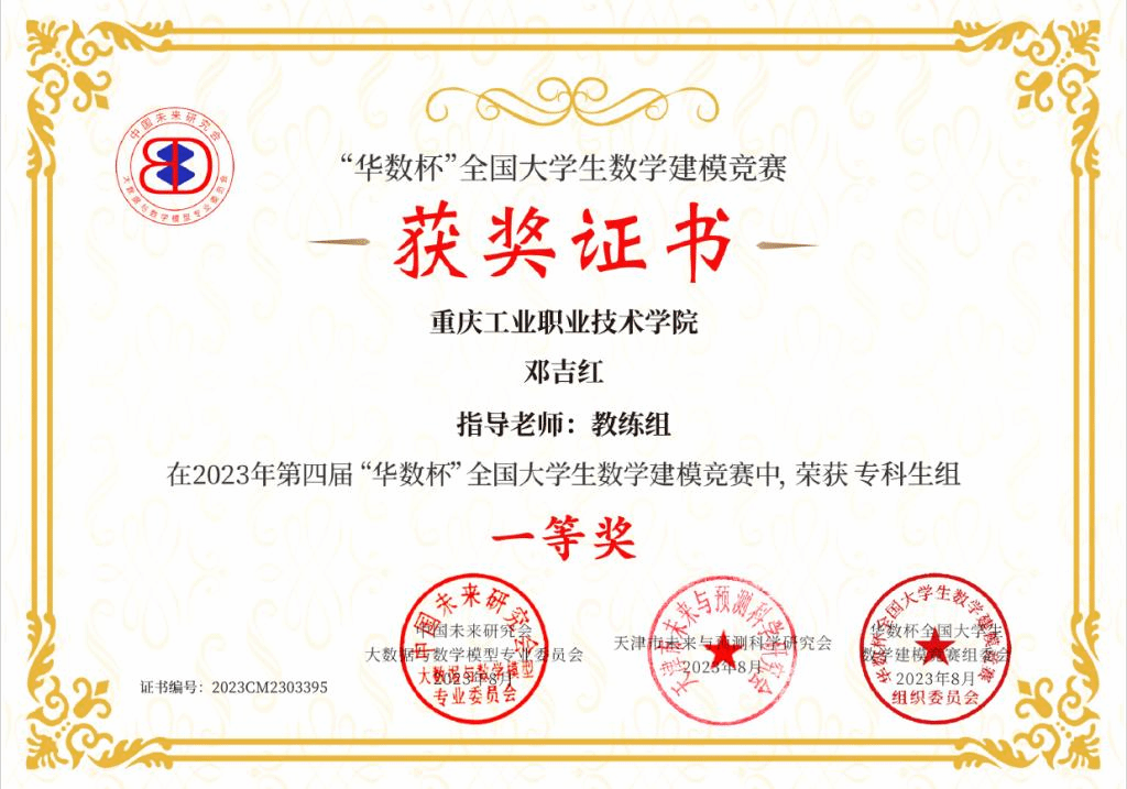 近期,我校学生团队在通识教育学院数理教研室数模教练团队的指导下,分别在2023年第四届“华数杯”全国大学生数学建模竞赛和2023年数维杯大学生数学建模竞赛中斩获专科生组全国一等奖,极大提升了学校在该类学科竞赛的影响力。