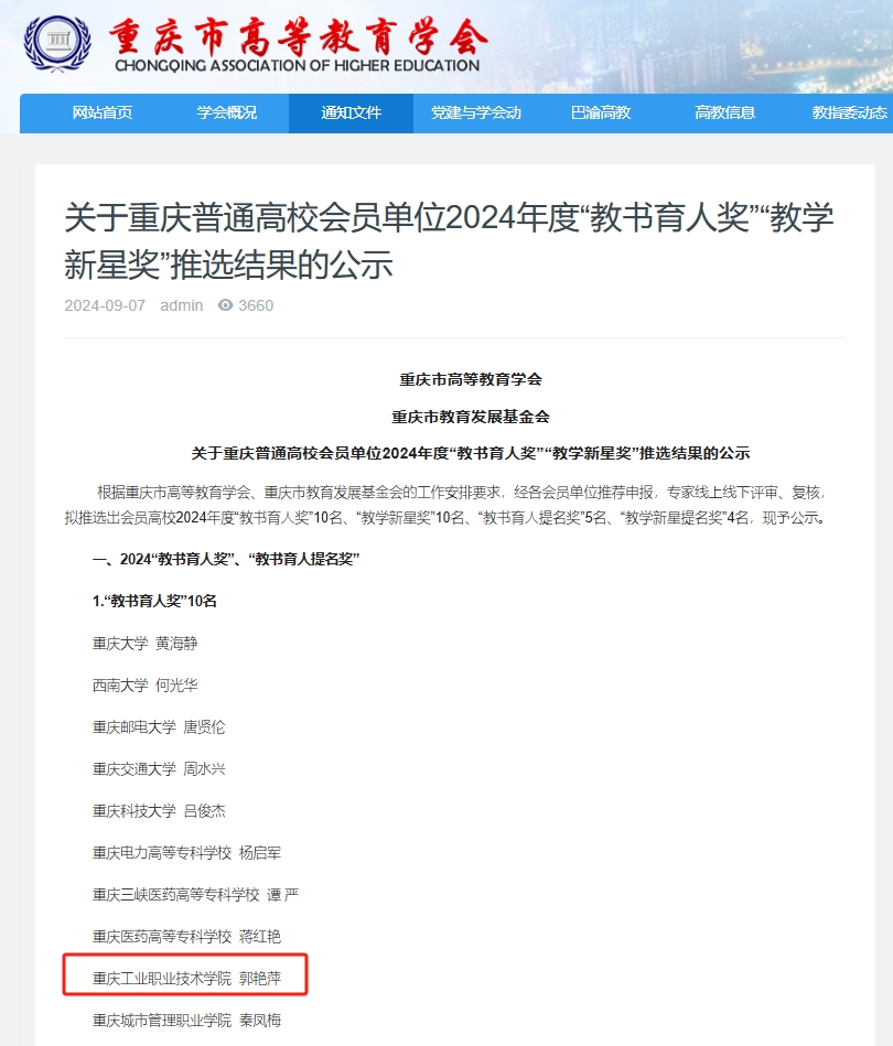 日前,学校荣获重庆市高等教育学会评选的第三届“新时代普通高校优秀教务处”荣誉称号,电气工程学院教师郭艳萍荣获2024年度“教书育人奖”荣誉称号,机械工程学院教师韩辉辉荣获“教学新星奖”荣誉称号。学校将坚持立德树人根本任务,进一步深化教育教学改革,加强师资队伍建设,提高人才培养质量,纵深推动学校高质量发展。