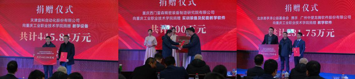 会议当天,天津宜科自动化股份有限公司、北京易孚泽公益基金会携手广州中望龙腾软件股份有限公司、重庆西门雷森精密装备制造研究院有限公司等对我校捐赠了共计一千多万元教学设施设备。