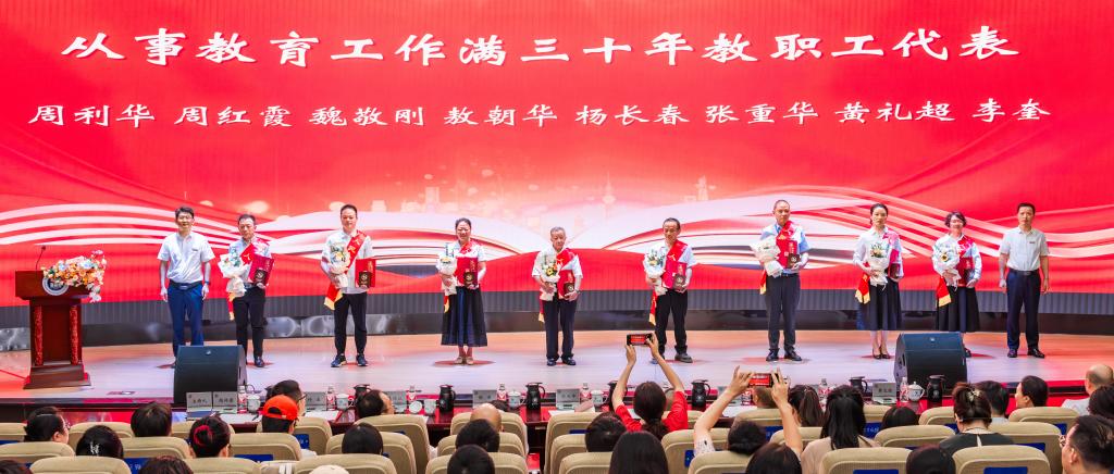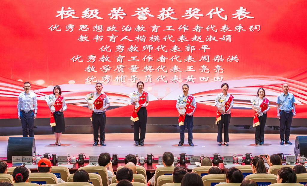 张荣宣读学校表彰奖励2024年度优秀教职工决定,通报2023—2024学年集体和个人获得省部级以上表彰奖励情况以及对从事教育工作三十年教职工的认定。经个人申报、单位推荐、学校组织评审并经学校党委审议通过,决定对2024年度33名优秀教师、13名教书育人楷模、27名优秀教育工作者等共计104名荣誉获得者进行表彰。张荣强调,希望全校教职工牢记为党育人、为国育才使命,以优秀教职工为榜样,不忘立德树人初心,在各自的岗位上扎实工作,以实际行动践行教育家精神。