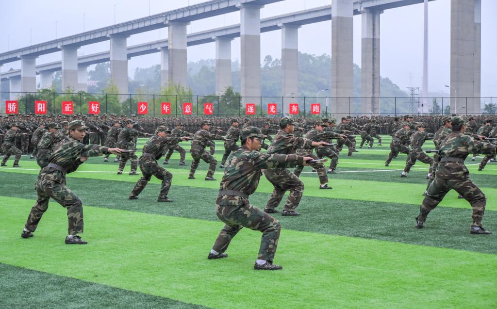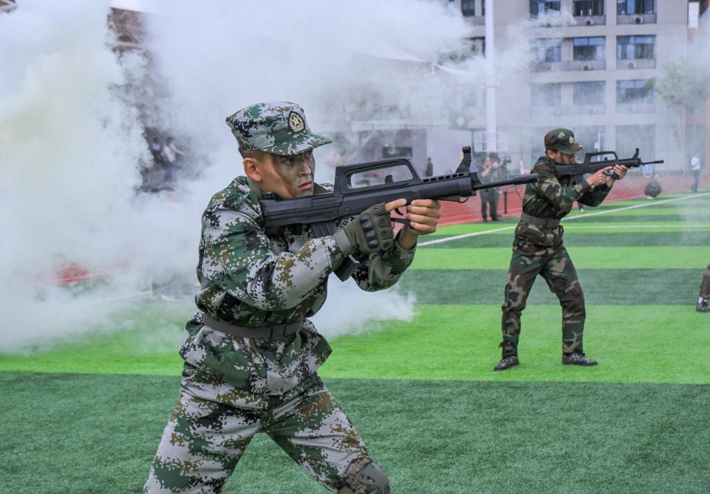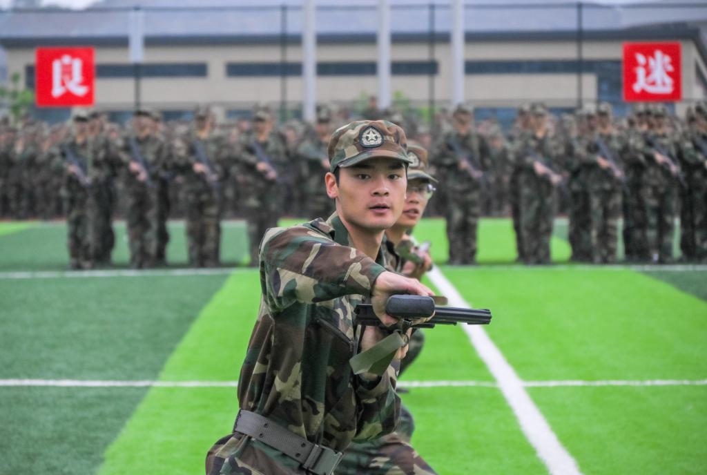 国歌声声催奋进,红旗猎猎映青春。军事训练成果汇报表演由20个军训连队以自信的姿态和昂扬的斗志依次走过主席台接受检阅。队列整齐划一,展现出军人服从命令、听从指挥的优良作风;匕首操女兵的巾帼风采赢得热烈掌声;刺杀操应急棍术气势如虹,战术队形灵活变换,军体拳其劲如铁,展现出重工大学子铿锵斗志。