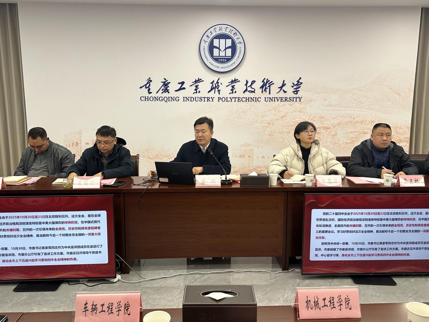 宣讲紧扣时代大局、现代化新重庆建设及学校“服务先进制造、赋能区域经济”的育人方向,以六大核心内容解读全会精神。袁国指出,全会对我市建设国家重要先进制造业中心、学校建设职教本科、新一轮“双高计划”意义重大,并深入阐释了“十五五”规划建议中“六个坚持”的原则与发展目标。结合学校定位,袁国强调,基建后勤处要深刻领会全会精神,树牢“以师生为中心”理念,在校园建设、服务保障等方面精益求精,护航学校高质量发展,服务现代化新重庆建设。经济与管理学院(文化旅游学院)要对接生产性服务业,聚焦现代物流管理、智慧商旅专业群,通过课程优化、校企共建实训基地等推动产教融合走深走实,着力培养兼具先进产业思维、扎实数字技能与优质服务能力的技能人才。