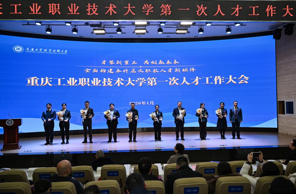 1月23日,学校第一次人才工作大会在两江校区第一学术报告厅召开,南川校区及各二级学院通过云直播设立分会场。本次大会以 “才聚新重工 共创赢未来——全面构建本科层次职教人才新矩阵”为主题,是学校升格为本科层次职业技术大学后首次召开的人才工作专题盛会,旨在凝聚人才共识、擘画发展蓝图,为学校高质量发展注入强劲动能。重庆市委教育工委委员、市教委副主任金玲,市人社局二级巡视员叶盛平,市教委人事处处长李斌、副处长余冠军,市人社局人力资源流动管理处处长王军国等出席会议。学校党委书记郭天平,党委副书记、校长周传德等全体校领导,科级以上干部及教师代表参加会议。会议由党委常委、副校长李雷主持。