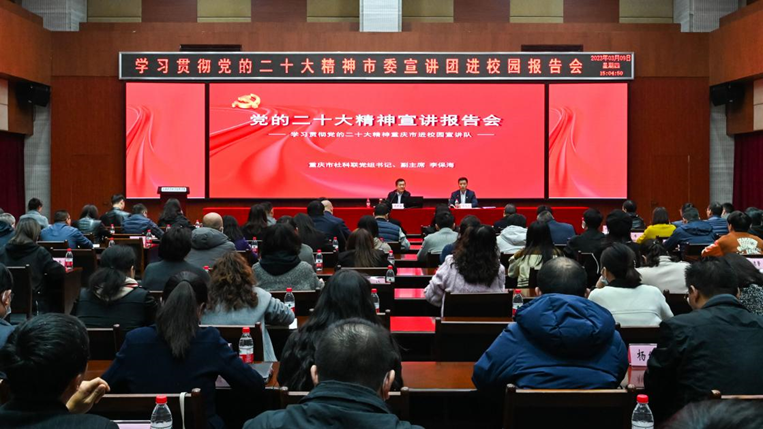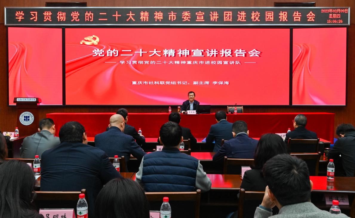 为深入学习宣传贯彻党的二十大精神,把力量凝聚到党的二十大确定的各项目标任务上来,引导广大党员干部、师生员工深刻领会党的二十大的精神实质和丰富内涵,3月9日,市委宣讲团成员,市社科联党组书记、副主席李保海来校作党的二十大精神专题宣讲报告。学校全体党委委员,科级以上干部(含纪检员、组织员)以及学生代表200余人参加会议,会议由学校党委书记郭天平主持。