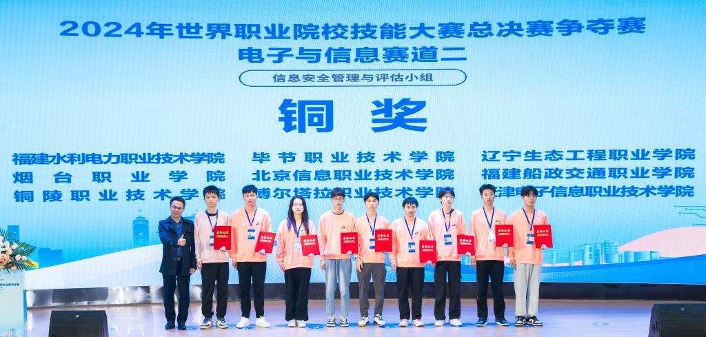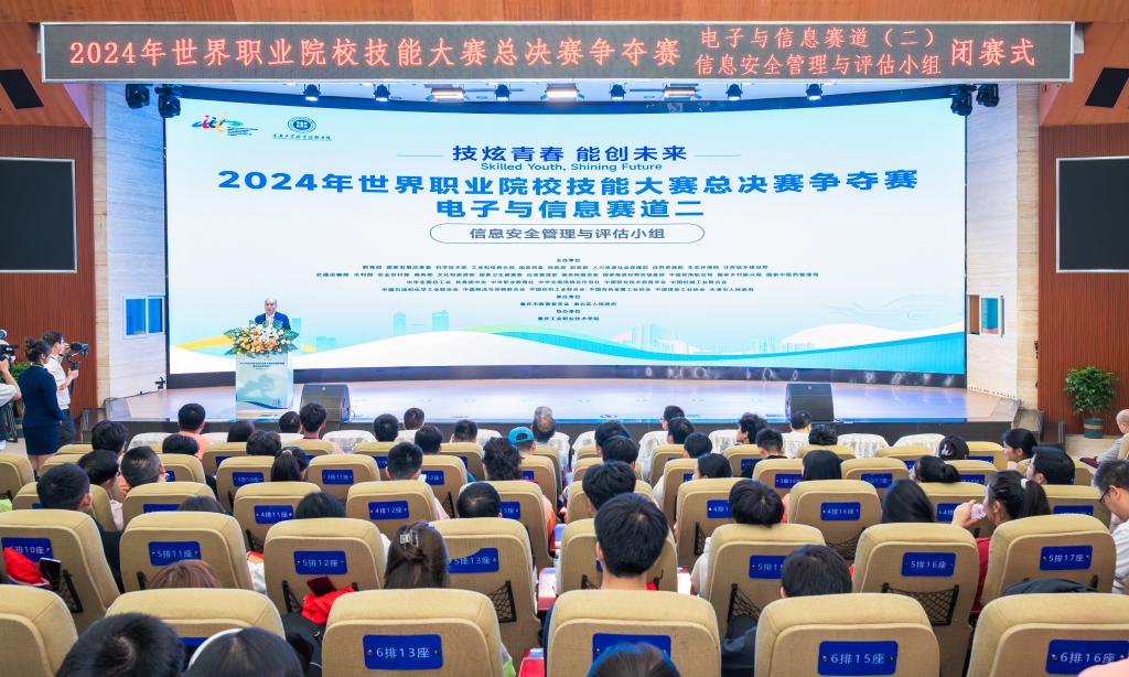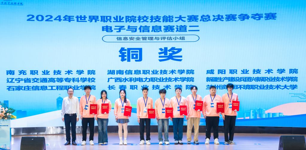 10月26日下午,2024年世界职业院校技能大赛总决赛争夺赛电子与信息赛道二(信息安全管理与评估小组)赛事闭赛式在重庆工业职业技术学院第一学术报告厅圆满闭赛。经过2天紧张有序的角逐,最终,重庆工业职业技术学院、嘉兴职业技术学院等6所高职院校的参赛团队荣获金奖,北京电子科技职业学院、郑州铁路职业技术学院等12所高职院校的参赛团队荣获银奖,南充职业技术学院、湖南信息职业技术学院等18所高职院校的参赛团队荣获铜奖。