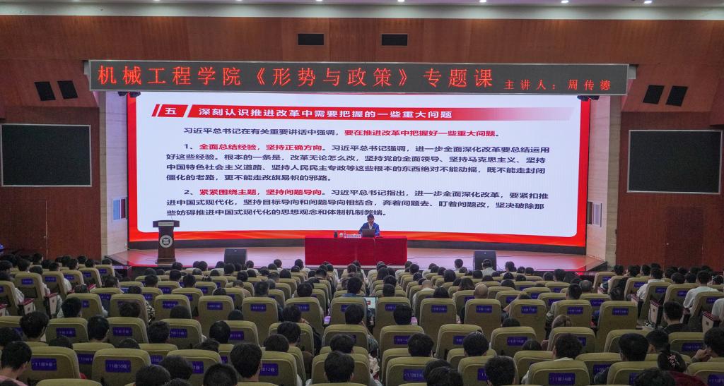 学校党委副书记张荣以《改革的实践续篇 现代化的时代新篇》为题向化学与制药工程学院师生讲授了时长2小时的形势与政策课。他以翔实的数据和生动的案例,系统梳理了党的十八大以来我国在全面深化改革进程中取得的显著成就,阐述了改革为国家带来的全方位变化,强调了改革开放对于国家发展的重要性,并结合当前国际国内形势,分析了改革面临的挑战与机遇。他鼓励广大青年学子积极投身改革实践,让青春在进一步全面深化改革、推进中国式现代化挺膺担当中谱写更加绚丽的青春篇章。